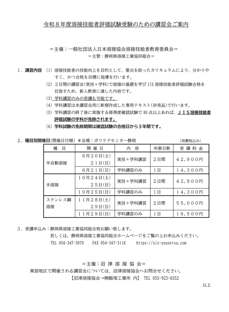 2025年12月11日 / 最終更新日 : 2025年12月11日 siz-yousetsu 対策講座のご案内 令和8年度 溶接技能者評価試験 受験のための講習会のおしらせ 詳細は半自動溶接講習は2月下旬頃、手溶接・ステンレス鋼溶接講習については6月下旬頃決定します。(沼津溶接協会での講習会については随時直接お問い合わせをお願いします。)