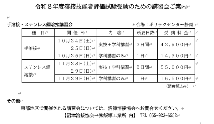 2026年2月24日 / 最終更新日 : 2026年2月24日 siz-yousetsu 対策講座のご案内 「半自動溶接」講習会開催のお知らせ(詳細) 毎回ご好評をいただいております溶接技能者評価試験受験者のための講習会のお知らせです溶接者の技能向上、スキルアップのために資格取得を目指す方へ、要点を押さえたカリキュラムにより、分かりやすくかつ合格を目標とした講習会です。学科講習終了後に実施する修得度確認試験の結果により、JIS溶接技能者評価試験の学科が免除されます。 申し込み書はこちら ☟ クリックするとPDFファイルが開きます