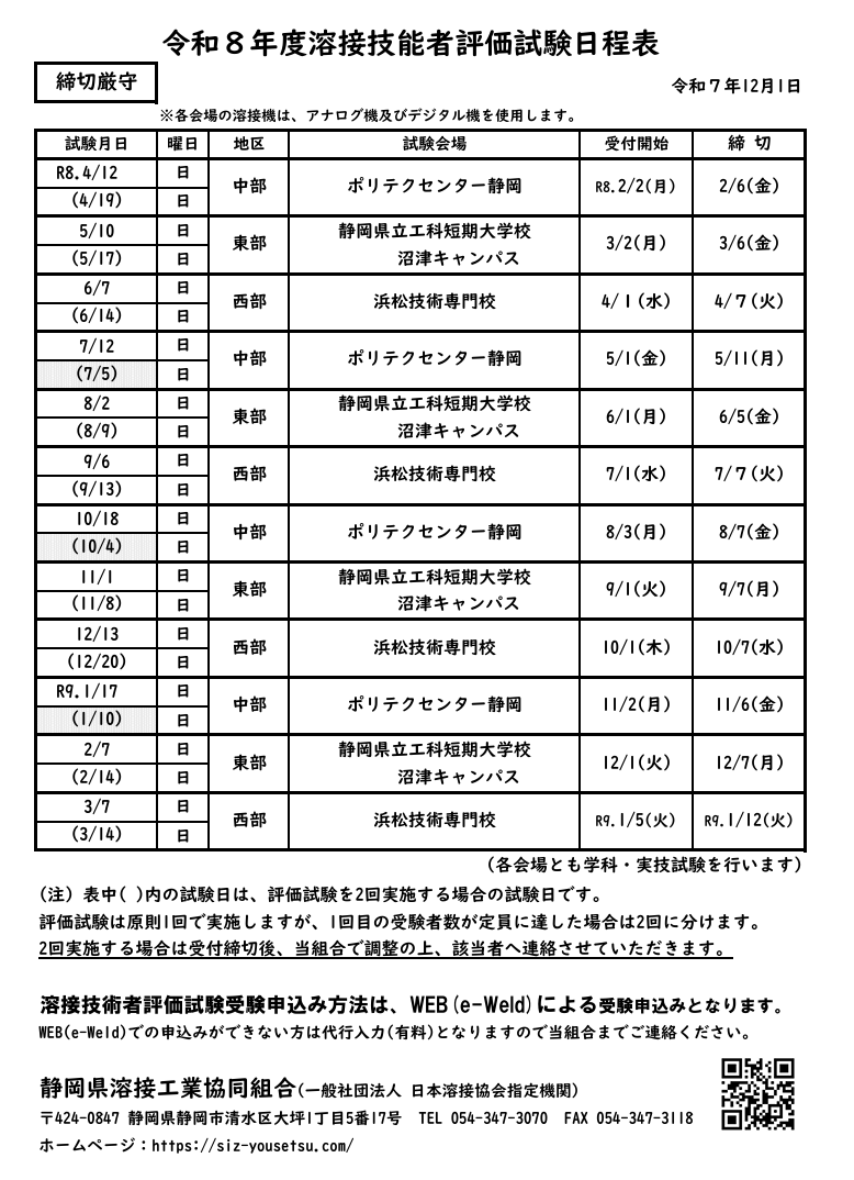 溶接技能者試験の日程表がPDFファイルでご覧いただけます。 令和8年度 溶接技能者評価試験 日程表 掲載しました2025年12月11日 JIS検定用のテキスト(受験の手引)申込書はこちらをクリックしてください **令和8年度中部地区日程では1回目と2回目(予備日)の日付にご注意ください** 西部地区、12月は1回目12/13、予備日12/20の予定です。